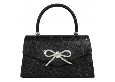 Bolso de tela con brillos, ideal para llevar de mano. Tiene una tira metálica en la parte superior con broche para abrir y cerrarla . Incluye...