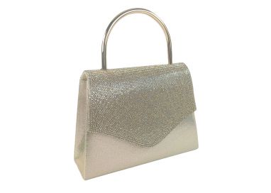 Bolso de tela con brillos, ideal para llevar de mano. Tiene una tira metálica en la parte superior con broche para abrir y cerrarla . Incluye...