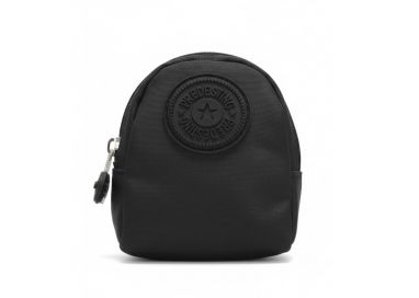 De tela tipo lona estilo deportiva, con 3 cierres de cremallera plastificados y sello circular al frente. Hecho en China.